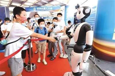 在北京亦創(chuàng)國(guó)際會(huì)展中心舉行的2022世界機(jī)器人博覽會(huì)上,小觀眾在與智能服務(wù)機(jī)器人握手。陳曉根攝(人民視覺(jué))