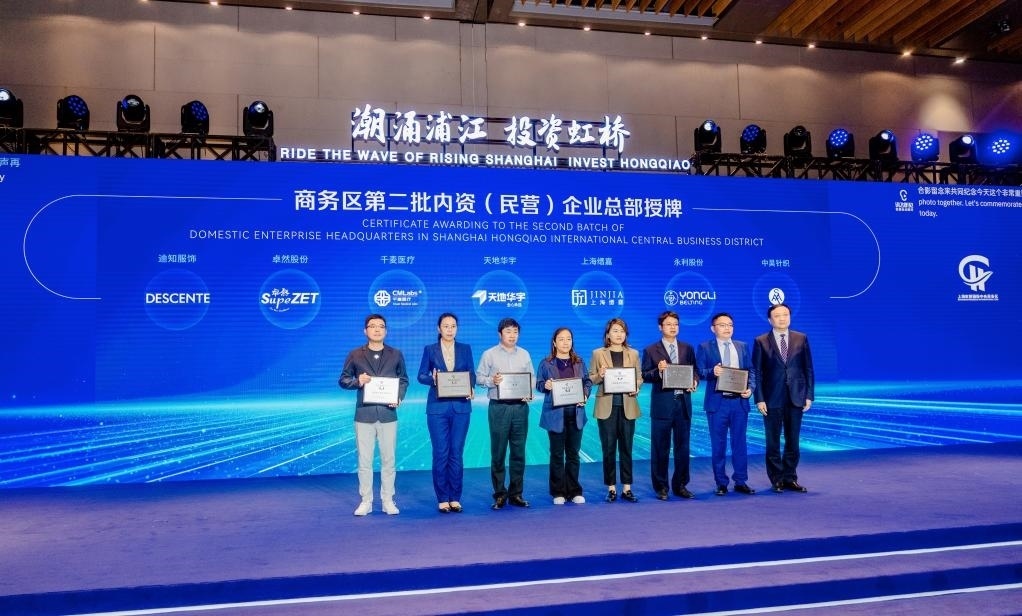5月25日,“潮涌浦江·投資虹橋”2023虹橋國際中央商務區(qū)投資促進大會現(xiàn)場,7家新認定的內(nèi)資(民營)企業(yè)總部集體授牌。新華社記者周蕊 攝