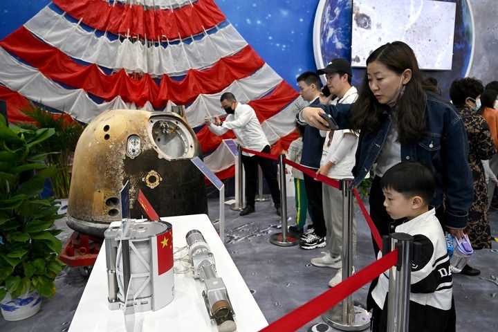觀眾在安徽合肥舉辦的以“走向世界的中國航天”為主題的展覽上參觀嫦娥五號(hào)返回器等實(shí)物展品(2023年4月24日攝)。新華社記者 黃博涵 攝
