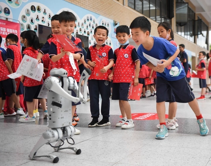 在湖南長沙華夏實(shí)驗(yàn)學(xué)校舉辦“科技大篷車”進(jìn)校園活動(dòng)上,學(xué)生們?cè)诤蜋C(jī)器狗互動(dòng)(2022年6月22日攝)。新華社記者 薛宇舸 攝