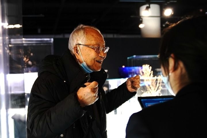 中國科學(xué)院院士汪品先在上海自然博物館舉行的“深海園林”展上介紹深海知識(shí)(2022年12月3日攝)。新華社記者 張建松 攝