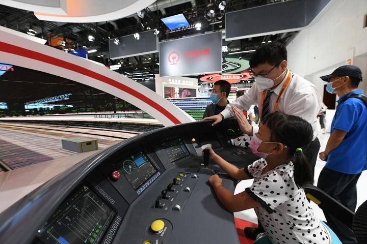 小朋友在2022年中國國際服務(wù)貿(mào)易交易會(huì)國家會(huì)議中心展館體驗(yàn)京張高鐵動(dòng)車組模擬駕駛臺(tái)(2022年9月3日攝)。新華社記者 任超 攝