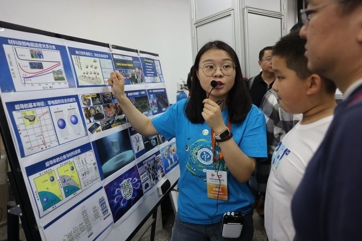 在中科院物理研究所超導(dǎo)國家重點(diǎn)實(shí)驗(yàn)室,志愿者在向參觀者普及超導(dǎo)知識(shí)(2023年5月13日攝)。新華社記者 金立旺 攝