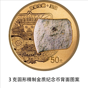 3克圓形金質紀念幣背面圖案為玉鉞造型,襯以良渚文化相關紋飾,并刊“國家寶藏·玉鉞”字樣及面額。