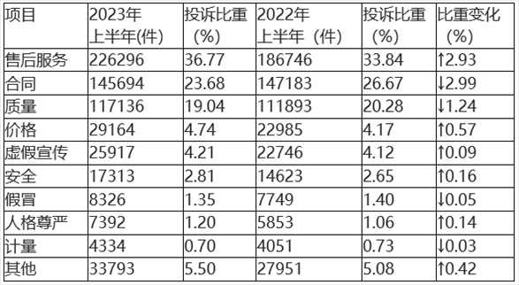 與2022年上半年相比(如表1所示),售后服務(wù)、價(jià)格問(wèn)題投訴比重上升較多,合同、質(zhì)量問(wèn)題投訴比重下降明顯,其余類投訴變化幅度較小。