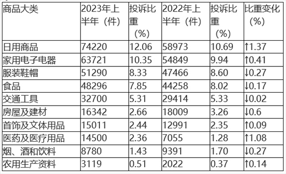 根據(jù)2023年上半年商品大類投訴數(shù)據(jù)(如圖2、表2所示),日用商品類、家用電子電器類、服裝鞋帽類、食品類和交通工具類投訴量居前五位。與2022年上半年相比,日用商品類、醫(yī)藥及醫(yī)療用品類投訴比重上升明顯,房屋及建材類投訴比重有所下降。