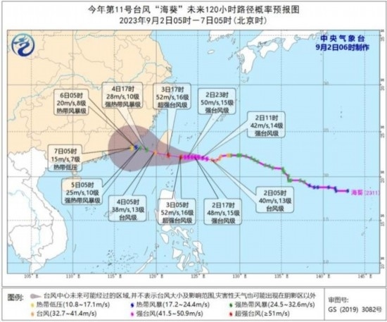 9月2日08時至3日08時,受“蘇拉”影響,南海西北部、北部灣東部、瓊州海峽及廣東沿海、廣西南部沿海、珠江口以及香港和澳門等地將有7-9級、陣風10-11級的大風,“蘇拉”中心經過的附近海面或地區(qū)風力有12-13級、陣風14-15級;受“??庇绊懀_灣海峽、浙江南部沿海、福建沿海、廣東東部沿海、臺灣島沿海將有6-7級,陣風8級大風,臺灣以東洋面部分海域風力可達8-10級,陣風11-12級,“??敝行慕涍^的附近海面風力可達12-13級,陣風14級。