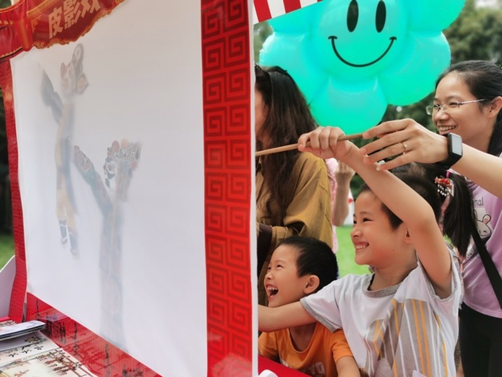 在上海桂林公園舉辦的“唐韻中秋”活動上,孩童體驗皮影戲。 新華社記者 陳愛平 攝