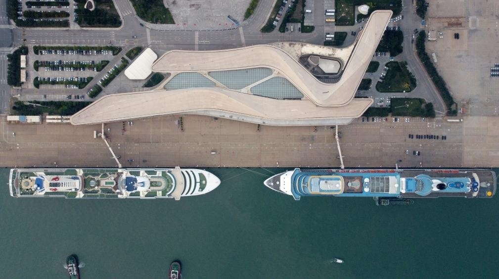 9月27日,“夢想”號郵輪(左)、“地中?!碧栢]輪靠泊在天津國際郵輪母港準備啟航(無人機照片)。新華社記者 趙子碩 攝