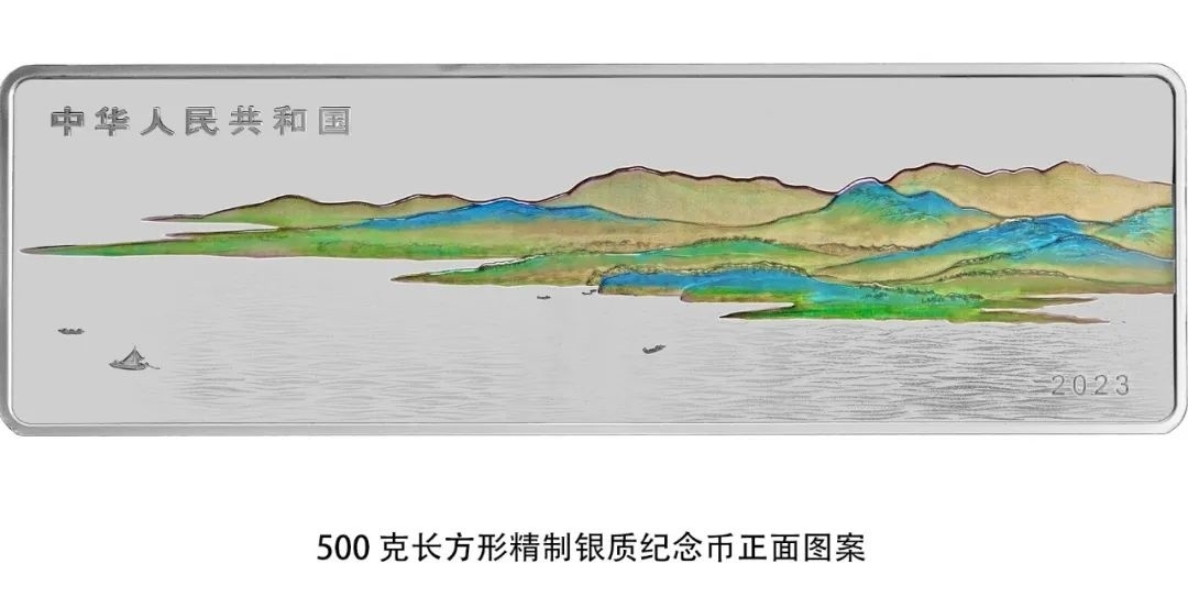 500克長方形銀質(zhì)紀念幣正面圖案為山、水等組合設(shè)計,并刊國名、年號。