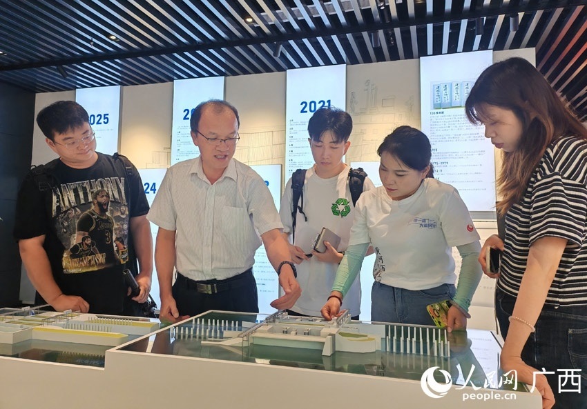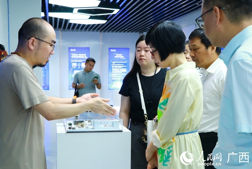 采訪團(tuán)在西部陸海新通道南寧國際鐵路港展廳內(nèi)采訪。人民網(wǎng) 嚴(yán)立政攝