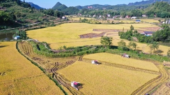 9月14日,在重慶梁平區(qū)蟠龍鎮(zhèn)扈槽村,收割機在稻田中收割水稻。(劉輝 攝)