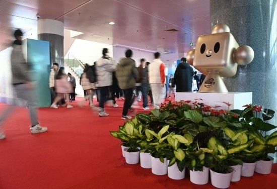 11月29日,鏈博會展廳入口處擺放著帶有“鏈氪”形象的小花壇引導觀展人群。