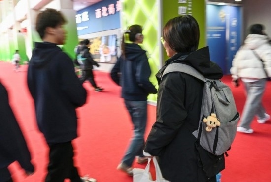 11月29日,一名觀展者將掛鏈款的“鏈氪”毛絨玩具掛在自己的背包上。