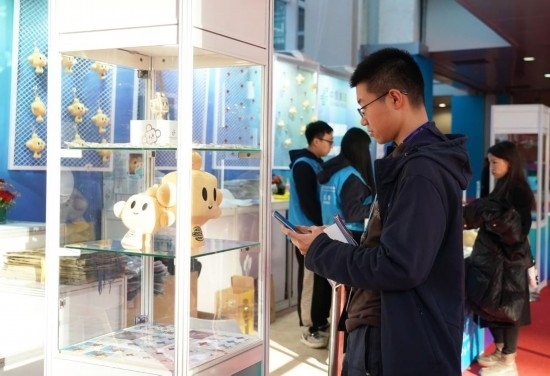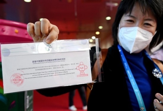 11月29日,一名在鏈博會文創(chuàng)小店服務的志愿者向記者展示帶有“鏈氪”形象的鏈博會專屬紀念郵折。