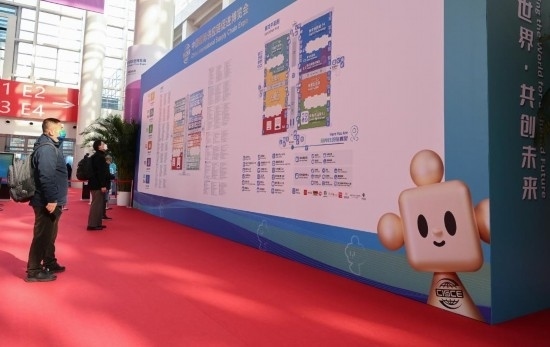 11月29日,鏈博會會場入口處的地圖導引墻上印有吉祥物“鏈氪”的形象。