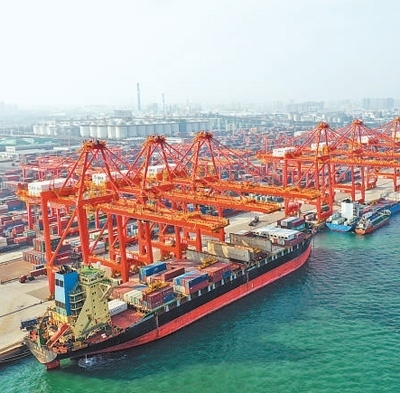 山東日照港,集裝箱碼頭正在進(jìn)行裝船作業(yè)。本報(bào)記者 陳 斌攝