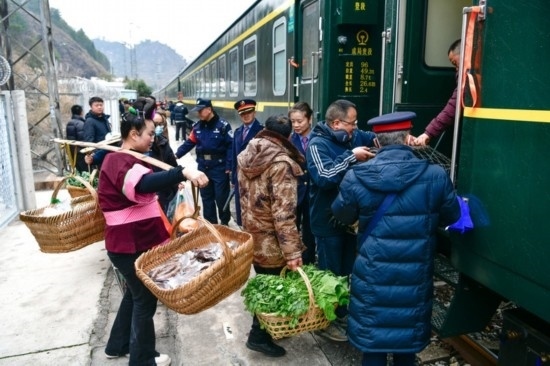1月26日,在滬昆鐵路六個(gè)雞火車站,村民準(zhǔn)備登上5640次列車售賣蔬菜和年貨。新華社記者 楊文斌 攝