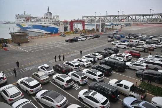 2024年1月26日,車輛在海口新海港等待登船。新華社記者 郭程 攝