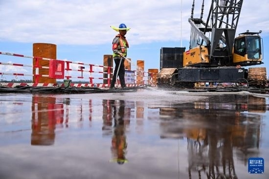 6月21日,中鐵建大橋局施工人員為萬(wàn)龍大橋主墩樁基作業(yè)平臺(tái)澆水降溫。