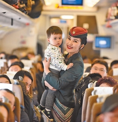 在蘭新高鐵D8803次列車上,乘務(wù)員與旅客互動(dòng)。擺風(fēng)亮攝(影像中國)