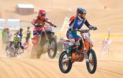 戶外運(yùn)動(dòng)愛好者在內(nèi)蒙古鄂爾多斯市杭錦旗參加摩托車沙漠越野場地賽。王 正攝(人民視覺)