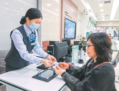 “社保服務(wù)事項(xiàng)進(jìn)銀行”是重慶市社會(huì)保險(xiǎn)局創(chuàng)新推出的一項(xiàng)公益服務(wù),合作銀行通過所有人工服務(wù)網(wǎng)點(diǎn)、智能自助服務(wù)終端以及手機(jī)銀行App,向群眾免費(fèi)提供社保服務(wù)。圖為中國(guó)農(nóng)業(yè)銀行重慶沙坪壩天星橋支行,工作人員為市民辦理相關(guān)社保業(yè)務(wù)。孫凱芳攝(人民視覺)