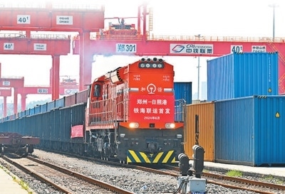 首趟鄭州至日照港鐵海聯(lián)運班列從鄭州經(jīng)開區(qū)圃田站啟程。王 瑋攝(影像中國)
