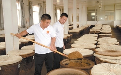 一旁,28歲的學(xué)徒李君正把缸里的醋醅翻到另一個(gè)醋缸之中。這是為了降溫而進(jìn)行的“打平翻缸”操作,要持續(xù)15天時(shí)間。“宋師傅說(shuō),發(fā)酵環(huán)節(jié)最難掌握的就是溫度的控制和時(shí)機(jī)?!币郧胺N地為生的李君,已經(jīng)跟著宋俊鵬學(xué)了5年釀醋,一個(gè)月有將近4000元的收入,“學(xué)會(huì)獨(dú)門技藝,咱也是手藝人了!”