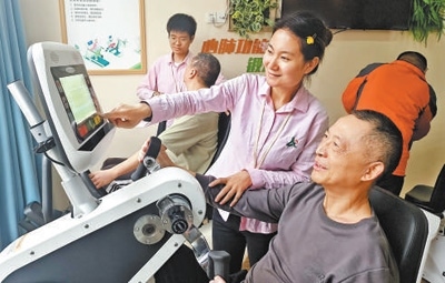 重慶萬(wàn)盛經(jīng)開區(qū)安博馨社區(qū)“智慧養(yǎng)老”養(yǎng)老中心,服務(wù)人員為老人講解智能器材知識(shí)。