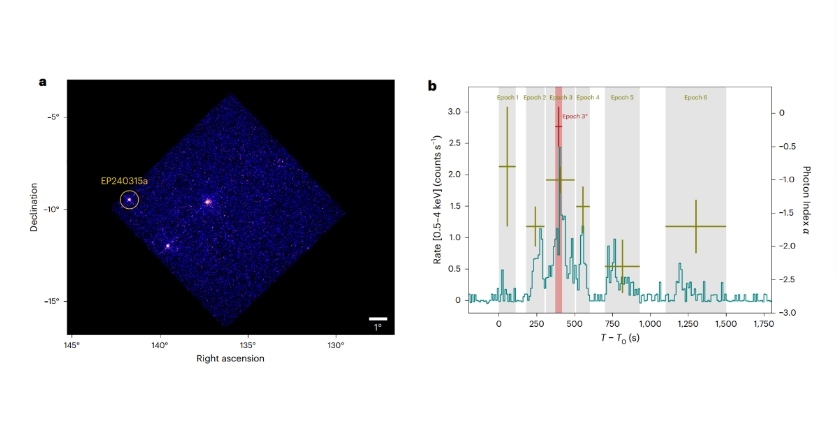 此后,世界各地多個天文望遠(yuǎn)鏡陸續(xù)觀測到EP240315a。研究結(jié)果表明,EP240315a產(chǎn)生于遙遠(yuǎn)的早期宇宙,當(dāng)時宇宙年齡僅為現(xiàn)在的10%,EP240315a的信號花費(fèi)了125億年才抵達(dá)地球。