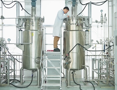 盈嘉合生研究人員查看發(fā)酵罐的發(fā)酵情況。