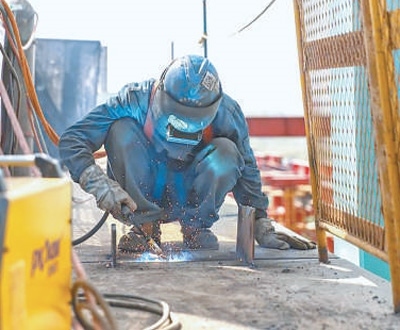 工人在橋面進(jìn)行焊接作業(yè)。
