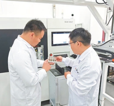 科研人員在檢查“材料數(shù)據(jù)工廠”高通量設(shè)備制備的多組元合金樣品。