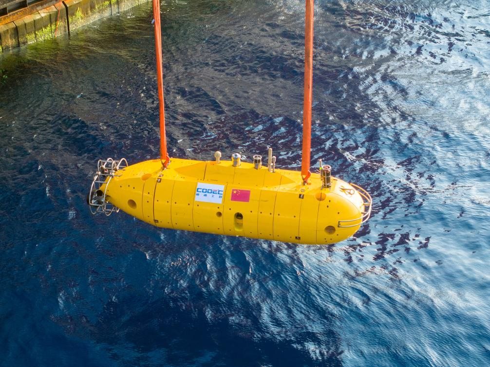 我國自主研發(fā)深水海管鋪設智能監(jiān)測裝備“海衛(wèi)”系統(tǒng)水下自主遙控機器人進行入海測試。(海油工程供圖)