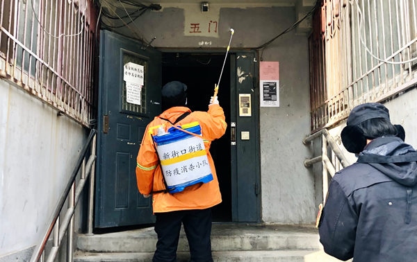 北草廠社區(qū)工作人員正在進行樓道消殺工作。人民網(wǎng) 王紫攝