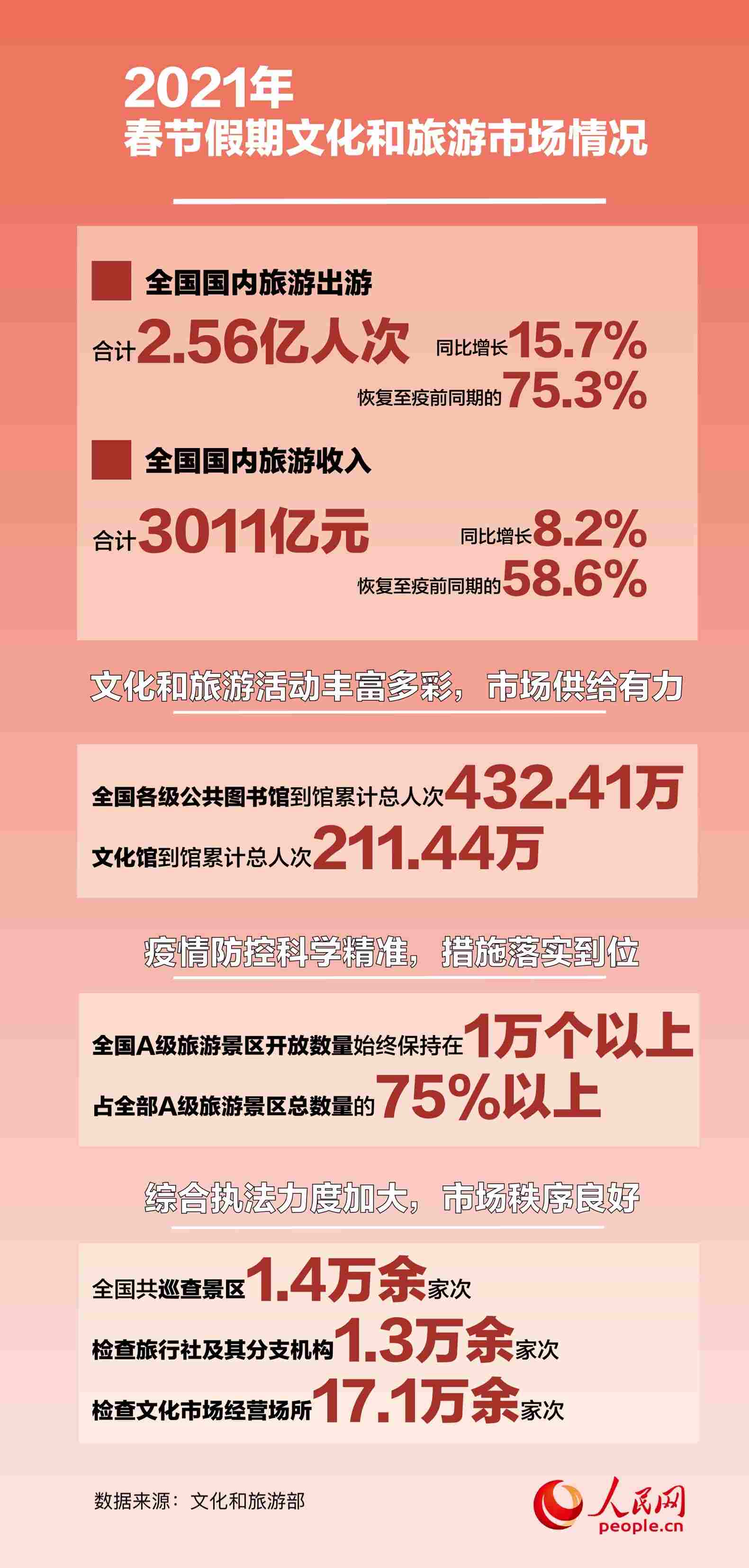 人民網(wǎng)北京2月25日電 (白帆)2月25日,文化和旅游部發(fā)布了2021年春節(jié)假期文化和旅游市場情況。數(shù)據(jù)顯示,綜合各地文化和旅游部門、通訊運營商、線上旅行服務商的數(shù)據(jù),經(jīng)文化和旅游部數(shù)據(jù)中心測算,春節(jié)假期七天,全國國內(nèi)旅游出游合計2.56億人次,同比增長15.7%,恢復至疫前同期的75.3%。實現(xiàn)國內(nèi)旅游收入3011億元,同比增長8.2%,恢復至疫前同期的58.6%。