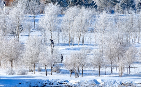 據(jù)了解,霧凇俗稱冰花、樹掛等,是低溫時空氣中水汽直接凝華,或過冷霧滴直接凍結(jié)在物體上的乳白色冰晶沉積物,表現(xiàn)為白色不透明的粒狀結(jié)構(gòu)沉積物。霧凇形成需要氣溫很低,而且水汽又很充分的自然條件,是非常難得的自然奇觀。