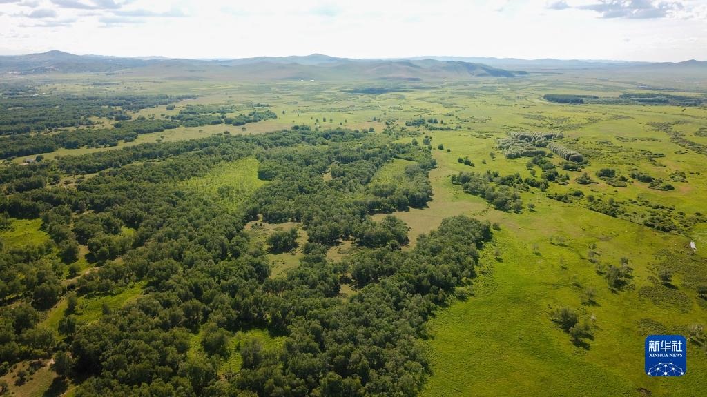 西烏珠穆沁旗巴拉嘎爾河畔的草原風光(7月19日攝,無人機照片)。