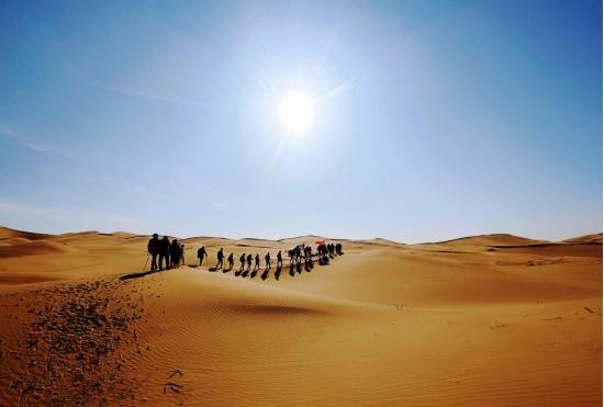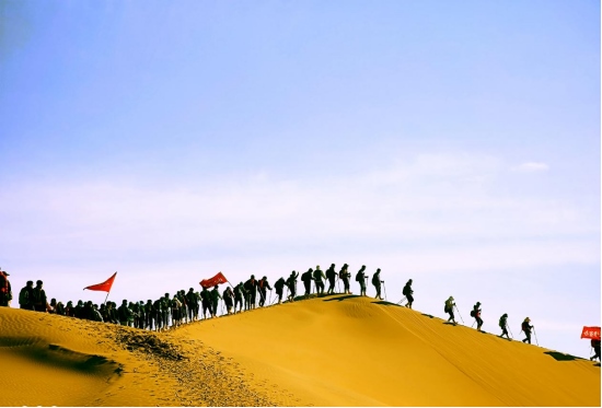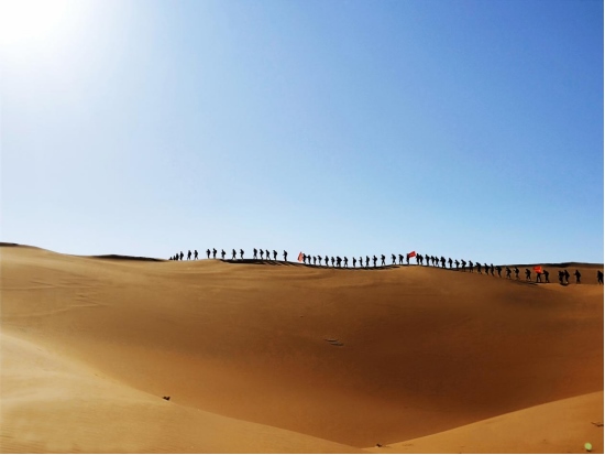 4月8日,內(nèi)蒙古鄂爾多斯杭錦旗境內(nèi)的庫布其沙漠,一隊(duì)游客正在沙漠中穿沙。