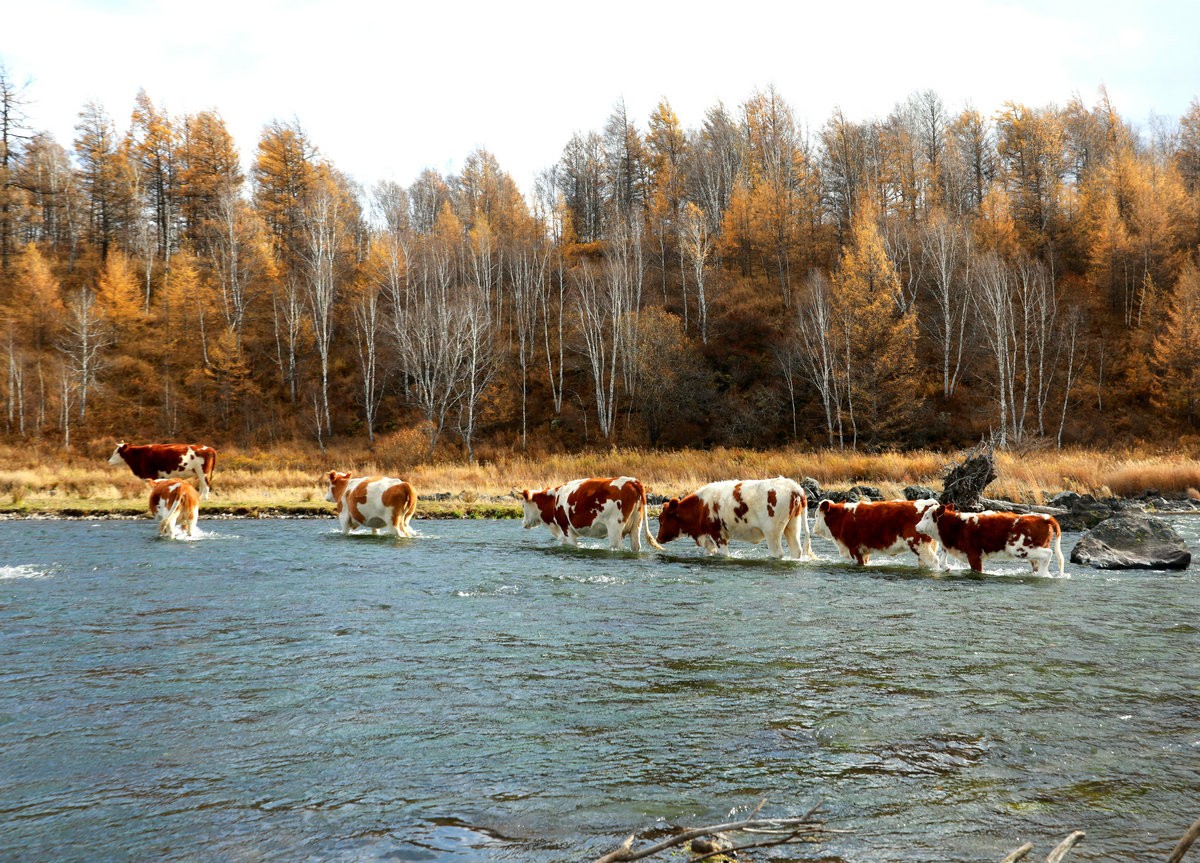9月29日,內(nèi)蒙古阿爾山國(guó)家森林公園一群牛蹚過不凍河 北疆新聞?dòng)浾?張楊攝影
