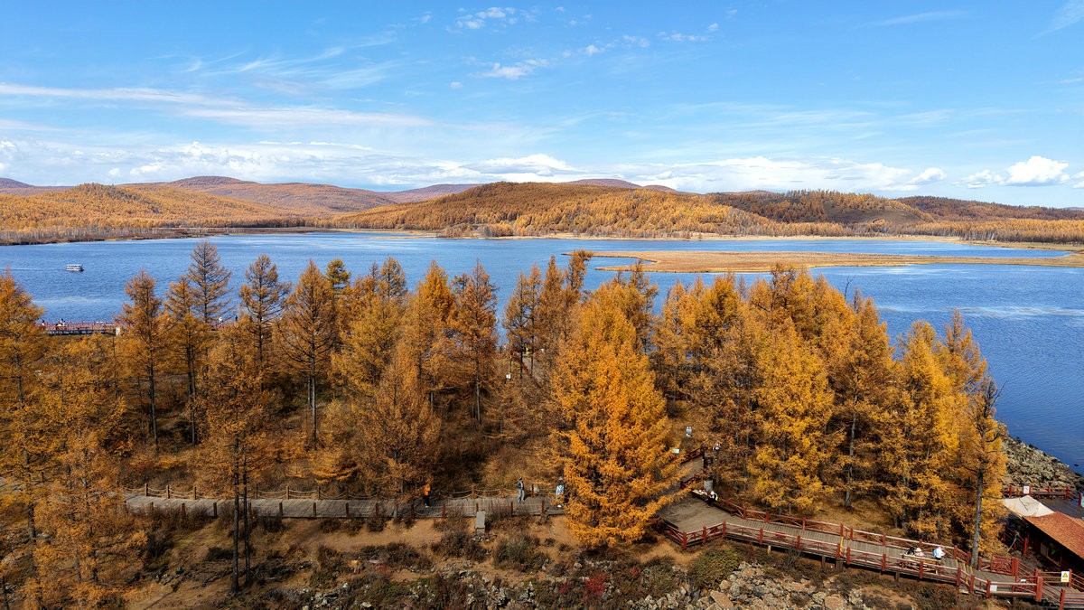 9月29日,空中視角下的內(nèi)蒙古阿爾山國(guó)家森林公園烏蘇浪子湖 北疆新聞?dòng)浾?張楊攝影
