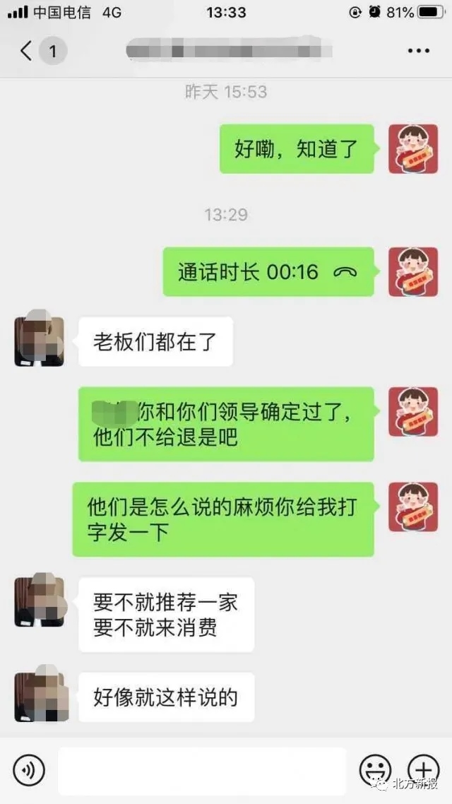高先生提供給記者的一份微信聊天記錄顯示,當(dāng)高先生提出退還押金的要求時,白泉山莊海世盛宴的工作人員告知,要不就推薦其他人到這里舉辦婚禮,要不就來這里消費(fèi)以抵消押金??傊?,押金是不能退的。