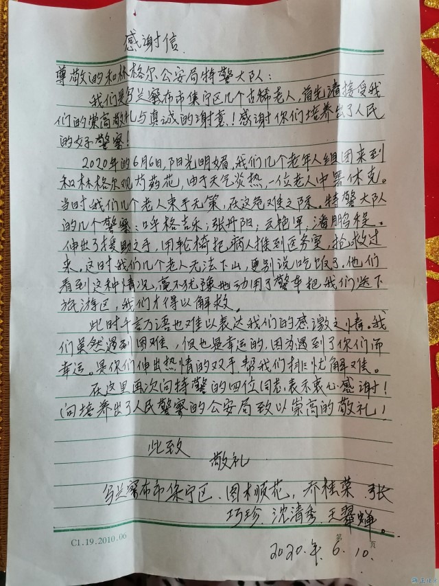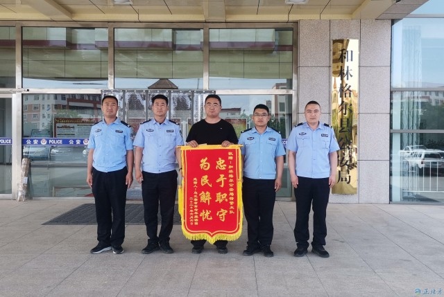 6月17日,呼和浩特市和林格爾縣公安局收到一個(gè)來自烏蘭察布市的快遞,收件人只寫著和林縣公安局,無具體部門與姓名。民警將其打開,里面竟是一面寫著“忠于職守、為民解憂”的錦旗、還有一封感謝信及一張合影照片。感謝信中寫道:此時(shí)千言萬語也難以表達(dá)我們的感激之情,我們雖然遇到困難,但也是幸運(yùn)的,因?yàn)橛龅搅四銈儯悄銈兩斐鰺崆榈碾p手,幫我們排憂解難……