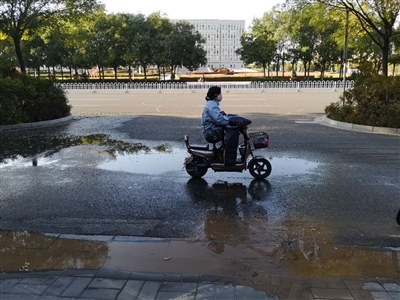 從張偉發(fā)來的視頻中可以清楚地看到,漏水點周圍淤積了大量黃泥,應該是地下自來水管漏水沖刷導致,新華西街市政府段南側(cè)非機動車道上有少量積水。