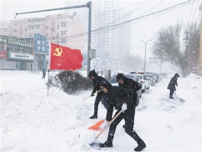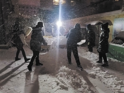 由雪花組成的白色天幕中,“迷彩服”一閃而過的綠色迸發(fā)出濃濃的生機(jī)。這些人手拿鐵鍬、掃把等工具一邊鏟雪清掃道路,一邊提醒過路行人:“小心路滑,注意安全?!睖嘏脑捳Z感染了兩邊的商戶,大家也紛紛加入到了“迷彩”防線,投入除雪運(yùn)動(dòng)中。