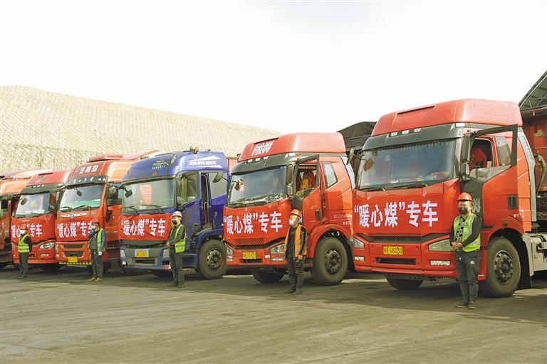 10月24日,一輛輛掛著大紅綢、載著“暖心煤”的運(yùn)煤大卡車(chē)排成一列,從鄂爾多斯達(dá)拉特旗杭蓋溝煤礦整裝待發(fā),即將發(fā)往位于吉格斯太鎮(zhèn)的榮通煤炭物流園區(qū),那里是該鎮(zhèn)“暖心煤”的發(fā)放點(diǎn)。
