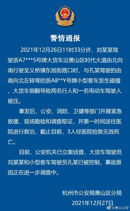 中新網(wǎng)12月27日電 杭州市公安局蕭山區(qū)分局27日通報,12月26日11時33分許,一大貨車與一小型客車在蕭山區(qū)一路口發(fā)生碰撞,大貨車側(cè)翻導(dǎo)致兩名行人和一名電動車駕駛?cè)吮粔?。截至目前?人經(jīng)醫(yī)院搶救無效死亡。