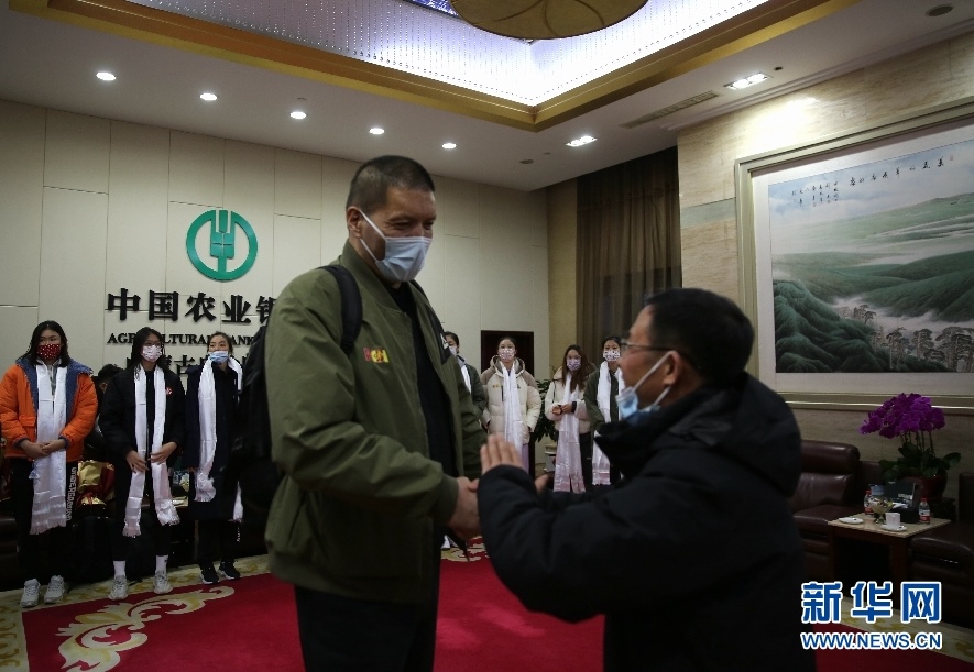 內(nèi)蒙古籃球協(xié)會(huì)主席巴特爾與前來(lái)迎接球隊(duì)的球迷握手。新華網(wǎng)楊騰格爾攝