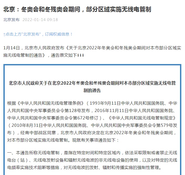 根據(jù)《中華人民共和國(guó)無線電管理?xiàng)l例》《中華人民共和國(guó)無線電管制規(guī)定》,經(jīng)商中部戰(zhàn)區(qū)同意,北京市人民政府決定在北京2022年冬奧會(huì)和冬殘奧會(huì)期間,對(duì)本市部分區(qū)域?qū)嵤o線電管制。具體有關(guān)事項(xiàng)通告如下: